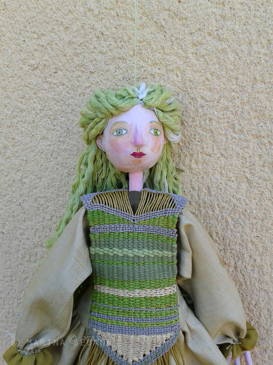 ¡Por fin he terminado la primera marioneta de la serie de 7 que empecé a preparar hace tiempo. Podéis ver parte del la proceso aquí. Es que entre los encargos de ilustración, los colgantes y collares, no consigo rescatar algo de tiempo para realizar las marionetas. Está hecha totalmente a mano con pasta de papel. El cuerpo es de tela rellena de algodón sintético. La ropa está cosida a mano. La parte central del vestido está realizada en telar a modo de mis colgantes textiles. El pelo es de algodón teñido a mano. zapatos de ante.